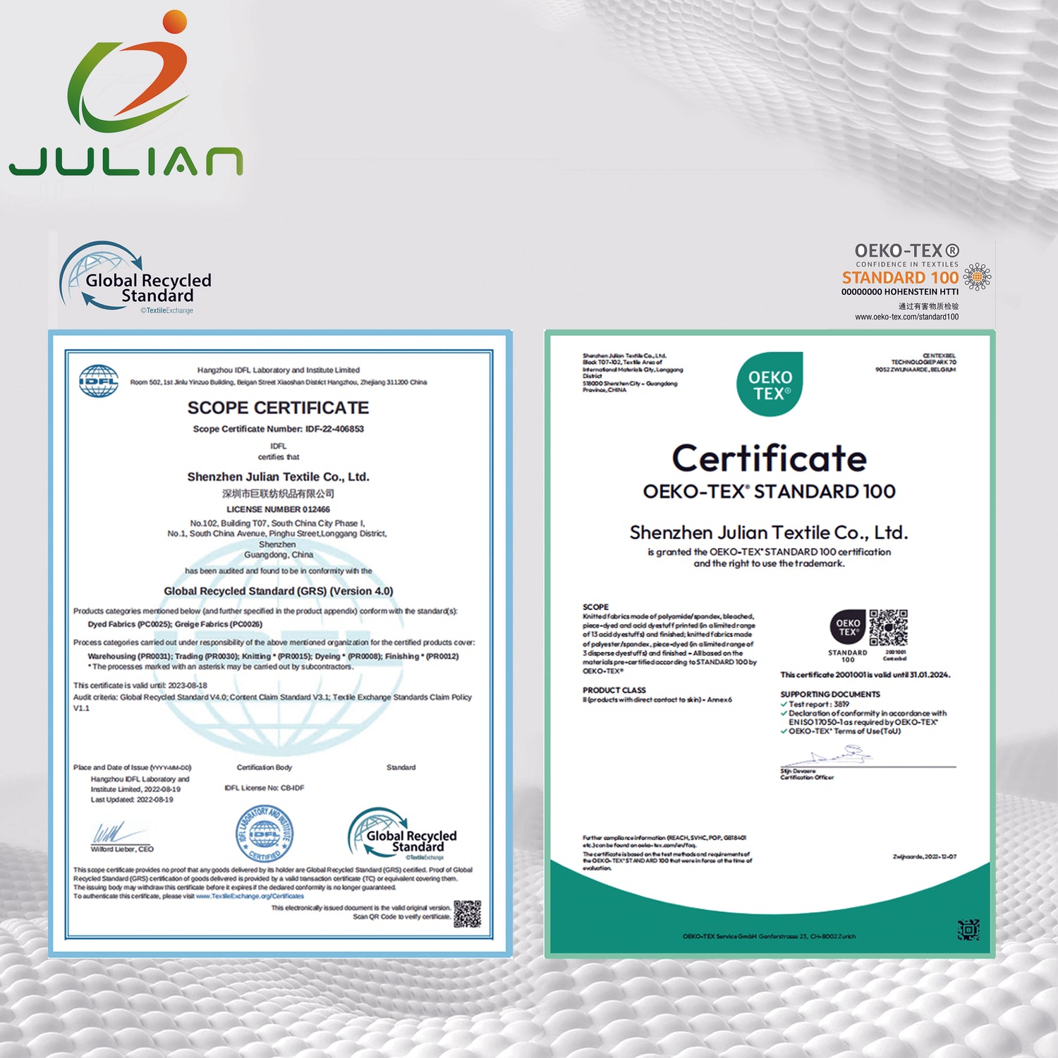 9. Possess GRS and OEKO-TEX 100 certificates