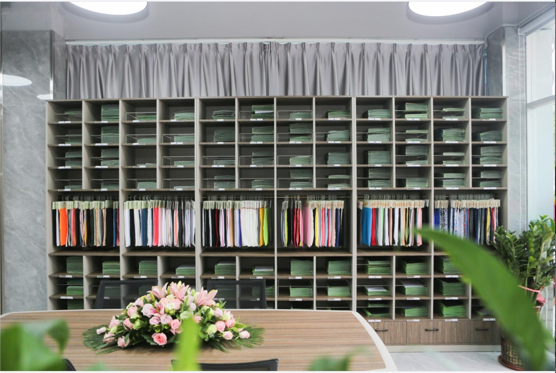 Our sales office building is located in Shenzhen City, Guangdong Province. It has convenient transportation, with a one-hour drive to the airport and a 30-minute journey to the high-speed rail station. Our business team and sample rooms are available in Shenzhen. The dyeing factory is situated in Meizhou, and the knitting factory is in Huizhou, both within Guangdong Province, with easy transportation.
